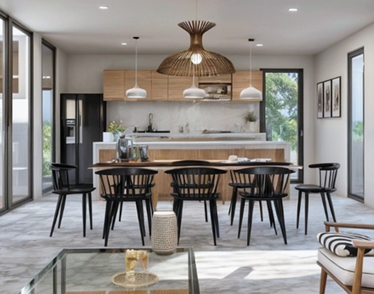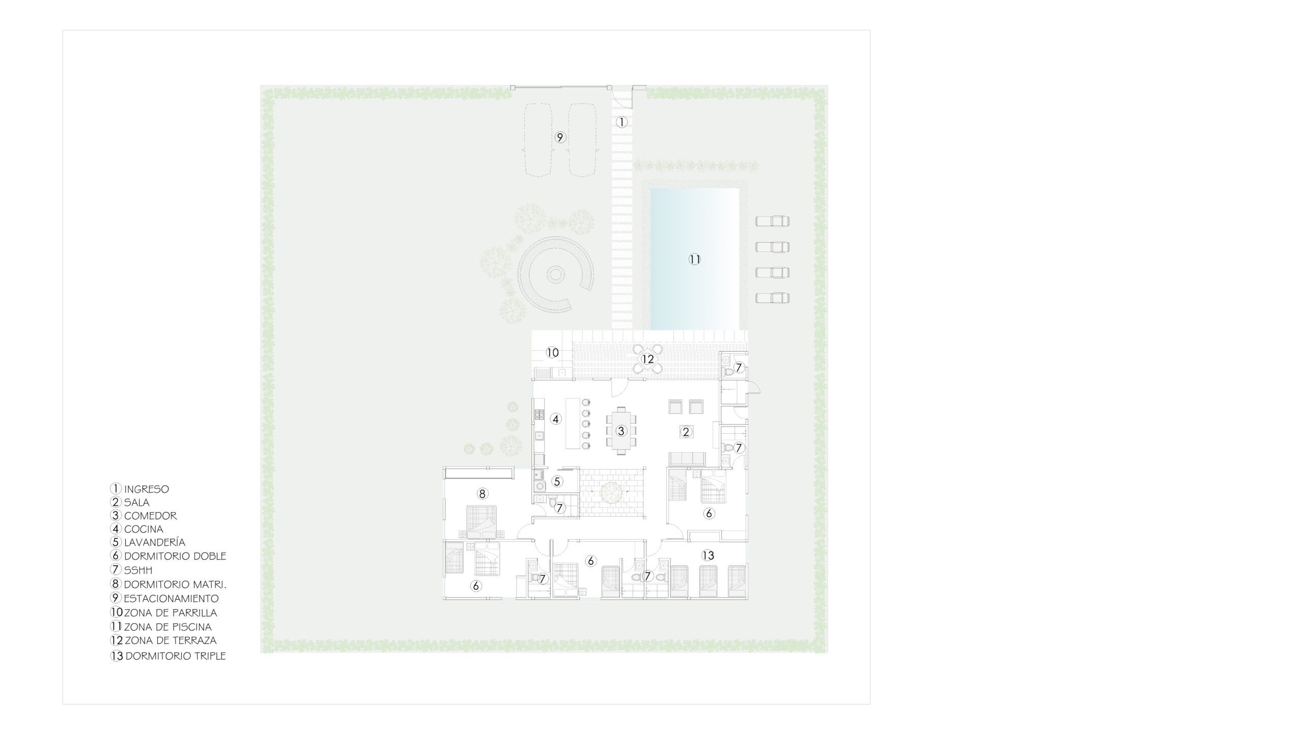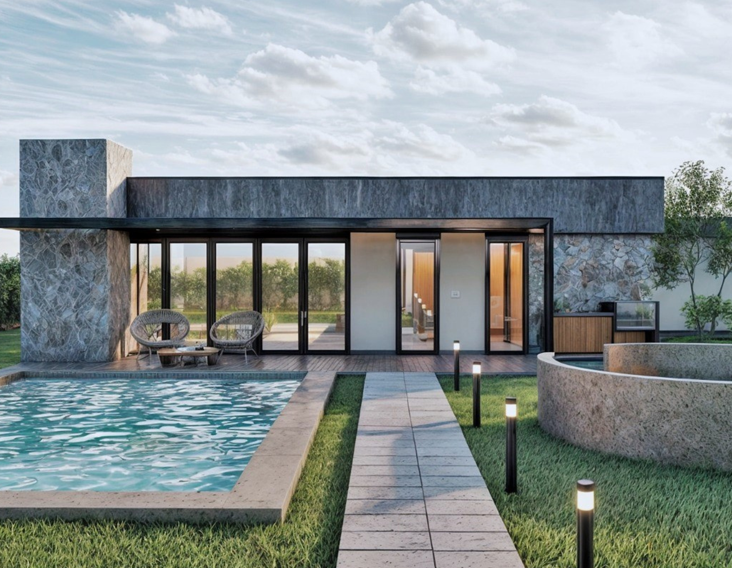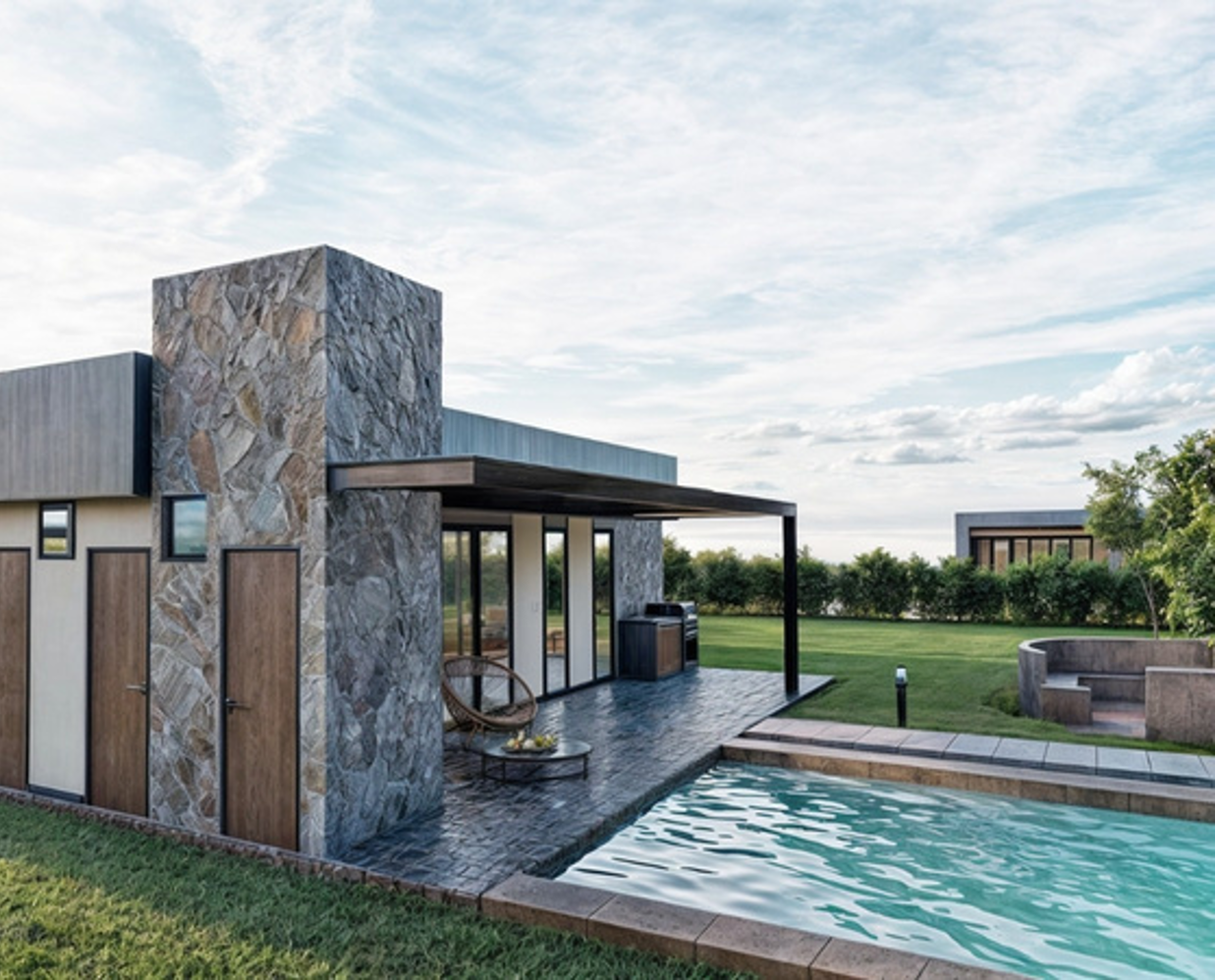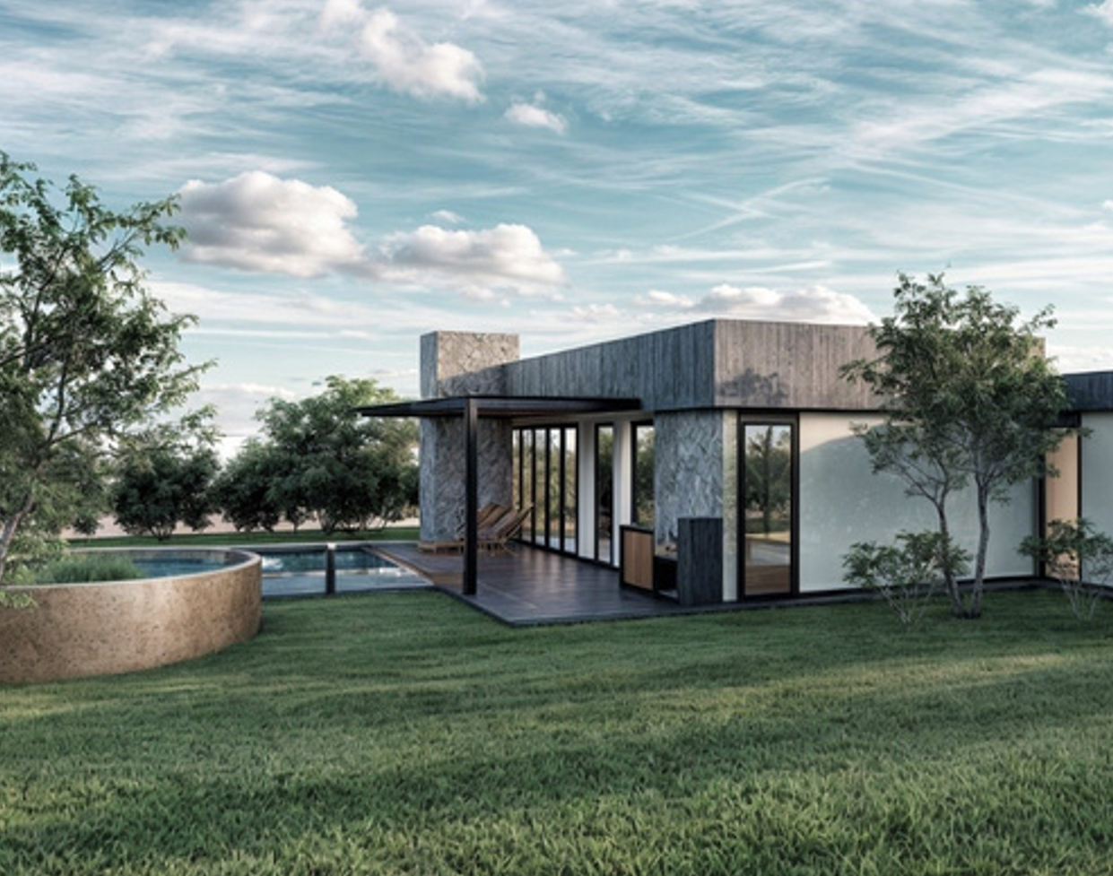 Casa de Campo Bahías: vivienda de diseño contemporáneo que integra espacios abiertos con áreas exteriores, logrando un ambiente cómodo, funcional y en armonía con el entorno natural.